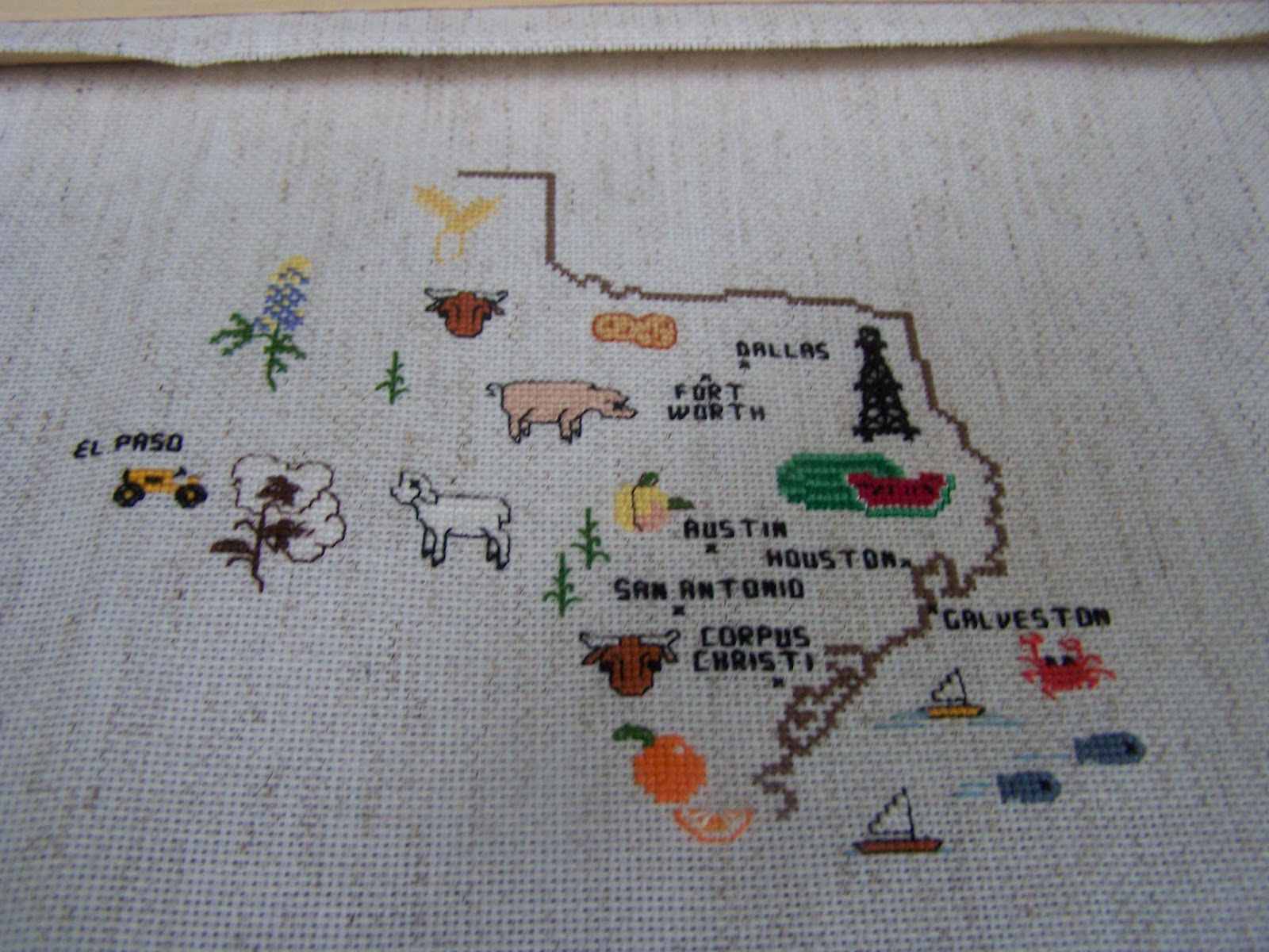 My week was slow up until Saturday. Then my chapter, Alpha Theta Masters of Beta Sigma Phi, had our beginning day luncheon to start our new year off. It was held at the Junior League of Houston and was great. I have a final(hopefully) doctor's appointment on Monday Morning and hopefully will start driving and wearing my sandals again. I did get a few stitchers in several of my WIPS and did get my Map of Texas completed. Now to back it with the Texas fabric and add the rope for a wall hanging. My Grandson, Christopher, will be 18 on Sept. 3 and he had picked the Map of Texas out and asked if I could stitch it for him. I plan on finishing it this afternoon, so next week will have a picture of it completed. Here are my pictures of the Map of Texas and the WIP progress for the week.